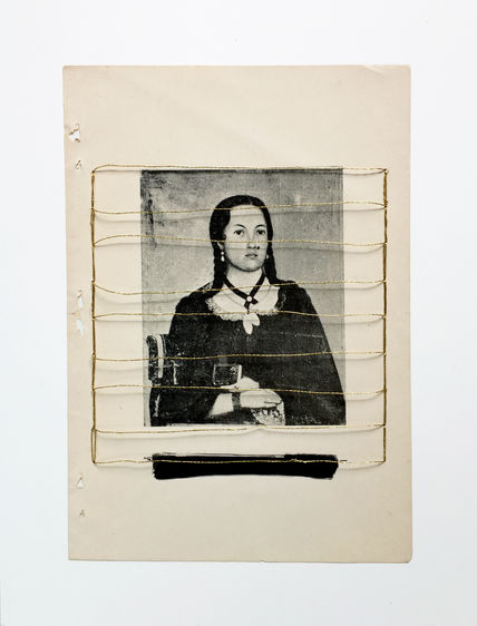 Esta serie se desarrolla a partir de la idea de intervenir un catálogo de arte colonial ecuatoriano. Las imágenes son intervenidas: violentadas por el hilo "dorado" y anulada su información con el negro, como forma de evidenciar la influencia cristiana occidental en el arte y artesanía local de Ecuador, en el marco del legado que dejó del reinado español.